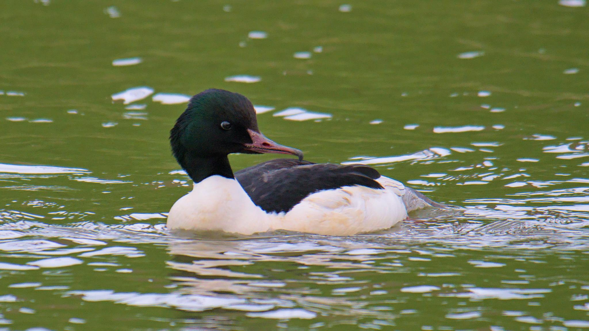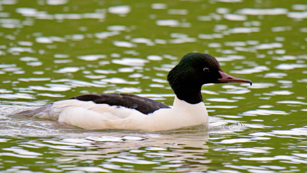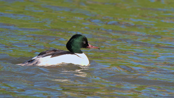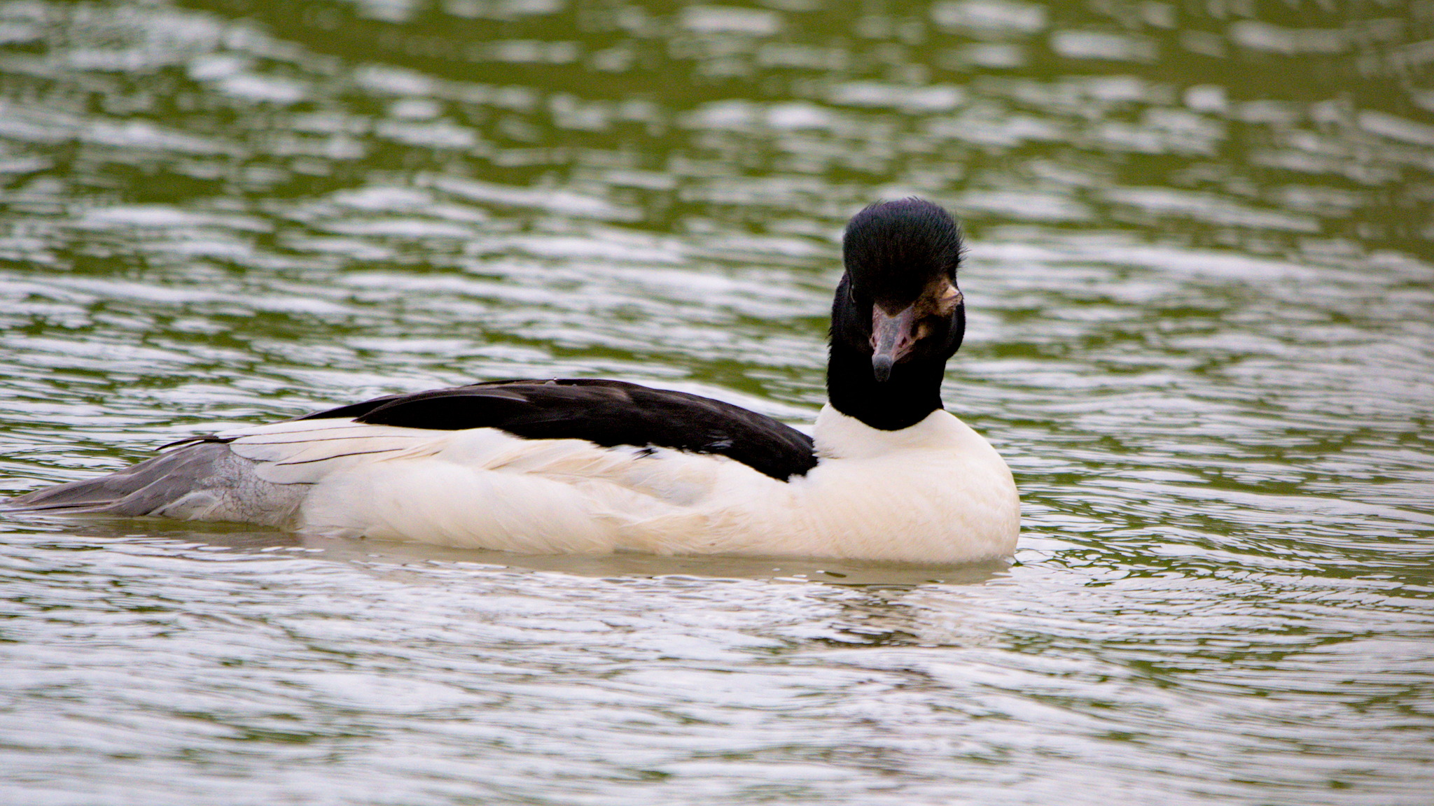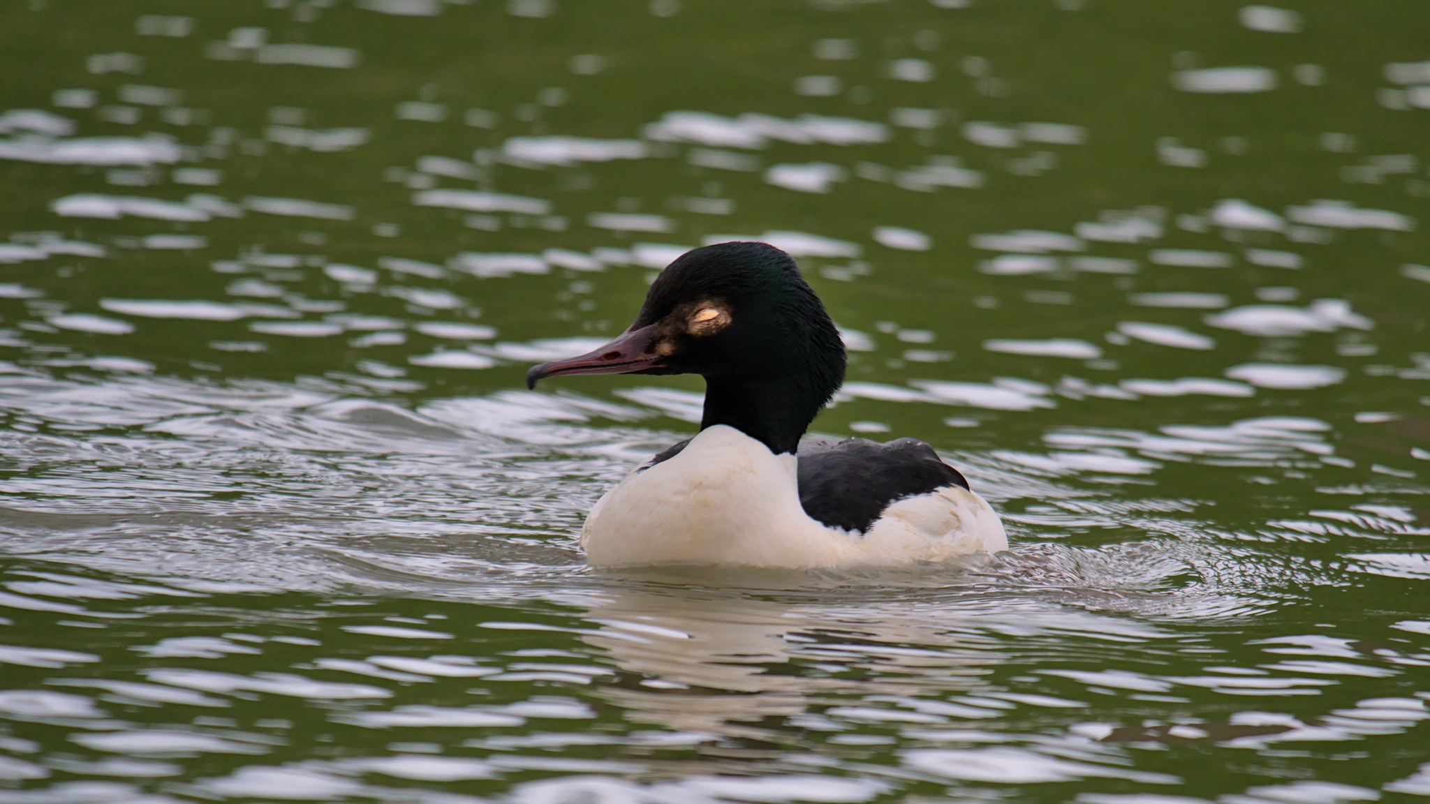 Tuin, 2 april: Grote zaagbek, met ontstoken/beschadigd linkeroog en snavelbasis