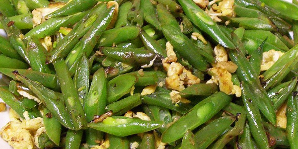 - Bak de knoflook heel even in de olie, en doe dan de boontjes erbij, met het zout, de peper, vetsin en suiker,